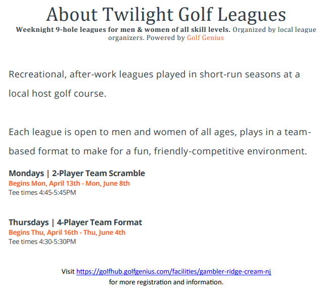 - (Note: Alternates Mondays with Cream Ridge Golf Course)